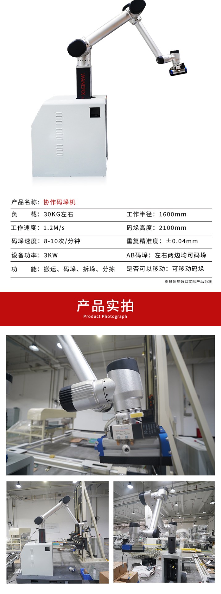 介紹:協(xié)作碼垛機器人是智能機器人,與人類工作人員緊密合作,提高生產效率、靈活適應不同任務。配備傳感器,能自主學習、感知環(huán)境。廣泛應用于紙箱、醫(yī)藥、食品等多個行業(yè)生產線。革命性提高生產線智能化程度,為工作人員創(chuàng)造更的工作環(huán)境。